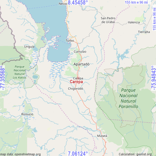 Carepa (Antioquia) is a seat of a second-order administrative division; located in Colombia in America/Bogota (GMT-5) time zone. With population of 20,627 people, there are 172 cities with bigger population in this country. Compared to other cities in Colombia, 79.2% of cities are located further ↓South; 89.2% of cities are located further →East and 88% of cities have higher elevation than Carepa. Note1